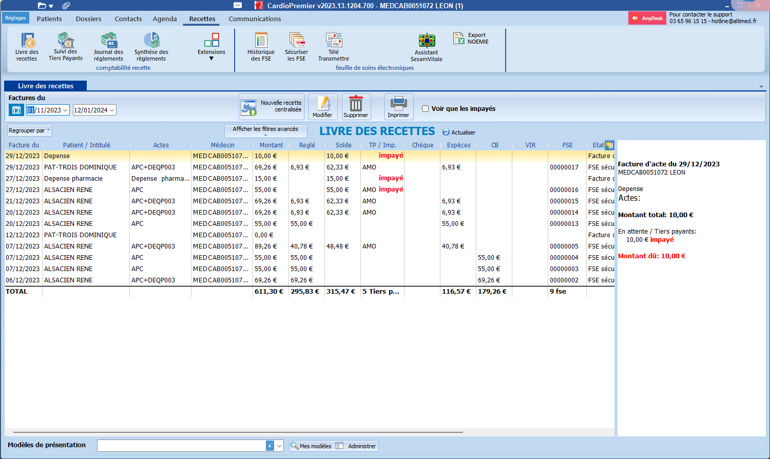 Journal et synthèse des règlements, pointage automatique des tiers payants, télétransmissions, livre de recettes, etc.